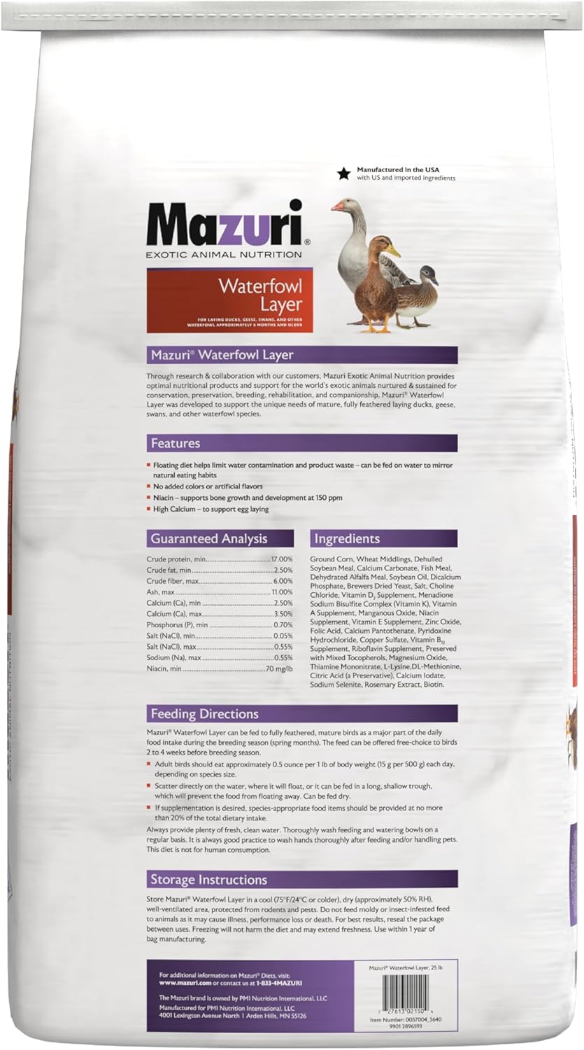 Mazuri Waterfowl Layer Diet is a food for laying ducks, geese, swans, and other waterfowl. This food supports breeding performance, egg numbers, fecundity, and chick viability. The food is complete and balanced and exceeds the niacin requirements for waterfowl. which supports their healthy growth and development. It requires no other supplements and is easy to use. Feed the floating pellets on the water to make it easier for your birds to eat. These floating pellets also help to keep the water clean. The food contains sustainable fishmeal and no added colors or flavors.