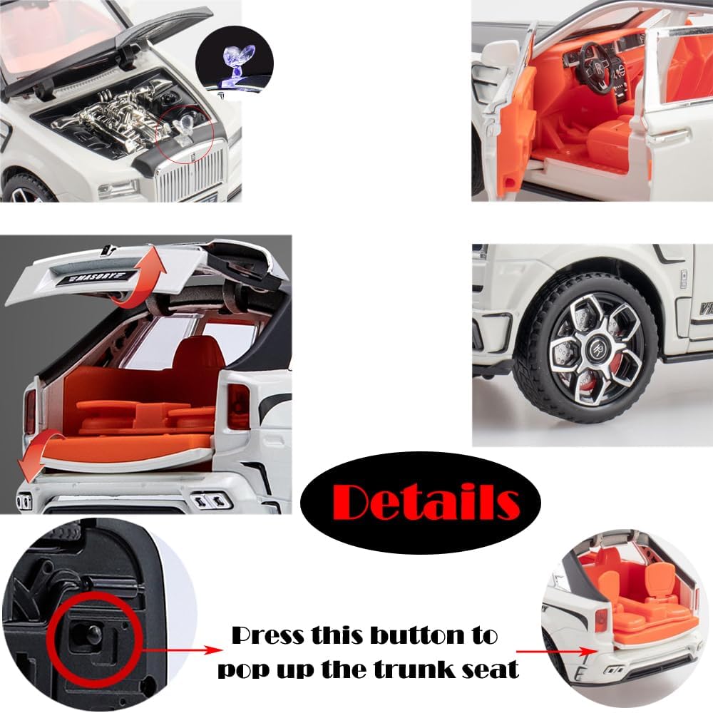 Basic InformationRatio: 1/24.Size: 9.92inches * 4.53inches * 5.12inchesPackaging: Independent color box.Weight: About 600g.Material: Alloy and plastic, with battery inside.Function: Sound&light, pull back. Door, hood & tailgates can be opened.Use Method1、Remove the insulating sheet at the bottom of the car.2、Press the front of the car lightly, there will be sound and light.3、Press the car to pull it back, and then let go, the car will run forward.Other Instructions1、Logo stored in the hood.2、Press the button next to the front wheel at the bottom of the car to open the hood.3、Press the button next to the rear wheels at the bottom of the car to fold the rear seats.4、Headlights, taillights, logo can light up.WarningChoking Hazard-small parts, not for children under 3 years.Note1、Do not mix old and new batteries.2、Do not mix alkaline, standard(carbon-zine), or re-chargeable batteries.